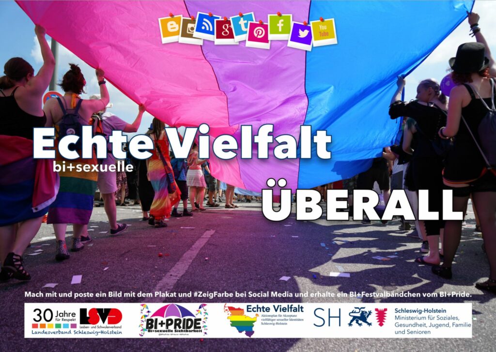 Vom 17.3. bis 10.4.2023 sorgen die vom Sozialministerium Schleswig-Holstein und der Gleichstellungsbehörde Hamburg geförderten Plakate der Initiative Bi+Pride für bi+sexuelle Sichtbarkeit.